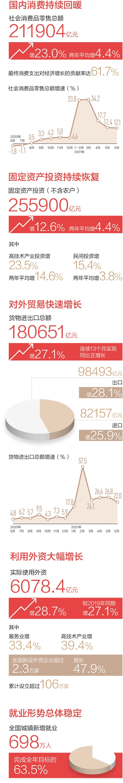 经济持续稳定增长。初步核算,上半年国内生产总值同比增长12.7%,高于6%以上的年度预期目标。其中,二季度同比增长7.9%,两年平均增长5.5%,比一季度加快0.5个百分点。