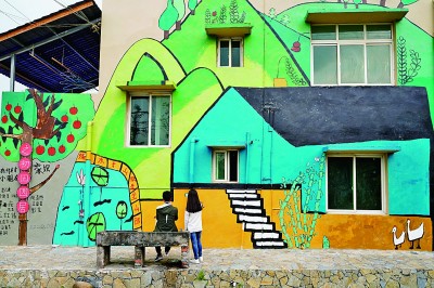 重庆市北碚区柳荫镇东升村联合四川美术学院参与村容村貌改善。图为游人在东升村参观。新华社发