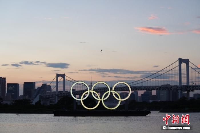 7月22日,日本东京湾台场滨海公园内的五环景观亮灯。这里是东京奥运会铁人三项的比赛场地。 中新社记者 韩海丹 摄