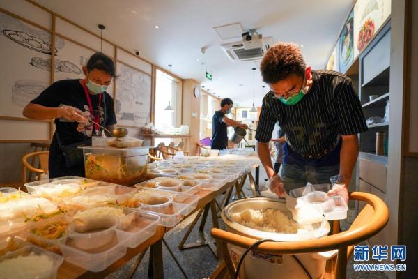 在扬州市广陵区文峰街道社区中心厨房,助老送餐服务队工作人员在分装为社区老人准备的饭菜(8月6日摄)。新华社记者 李博 摄