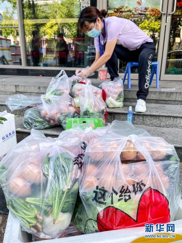 8月8日,在扬州市广陵区汶河街道皇宫社区,社区工作人员在包装蔬菜鸡蛋等,准备为居民送菜上门。新华社记者 李博 摄
