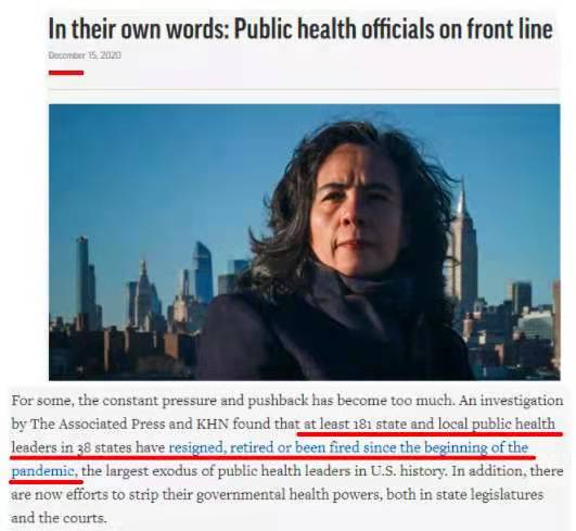 △美联社:在一片反智反科学的抗疫逆流下,仅在去年4月至12月期间,美国就有38个州的至少181名公共卫生官员辞职、被解雇或选择退休,造成美国史上最大规模的公共卫生官员离职潮。