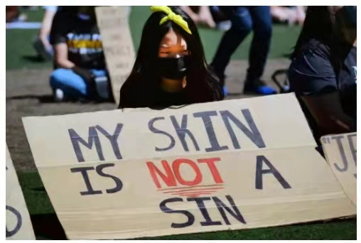 △在洛杉矶举行的抗议活动中,亚裔示威者打出“我的肤色(skin)不是罪(sin)”的标语。
