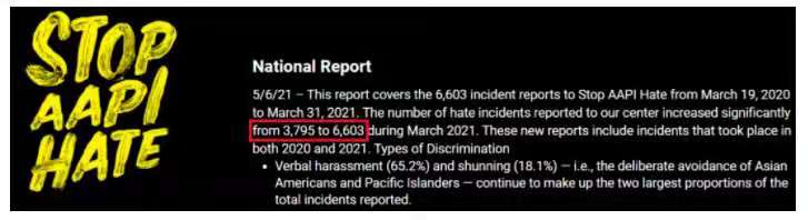 “停止仇恨亚太裔美国人”(Stop AAPI Hate)组织截至目前的最新统计显示,自去年3月至今年3月,美国已知的针对亚太裔的仇恨犯罪案件数量达到6603件,较上一年同期大幅增加了74%。