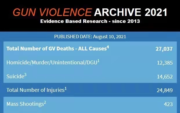 美国枪支暴力档案网(GVA)的最新统计数据显示,截至当地时间8月10日,今年以来全美(不包括自杀在内的)各类枪支暴力事件已导致超过1.2万人丧生;造成四人以上伤亡的大规模枪击案已发生423起。