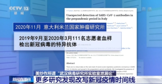 2020年11月,意大利米兰国家肿瘤研究所等机构研究人员在该国《肿瘤杂志》上发表论文说,他们检测了2019年9月至2020年3月参与肿瘤筛查试验的959名志愿者的血液样本,结果发现,其中111名志愿者血样中存在新冠病毒的特异抗体,占志愿者总数的11.6%。论文第一作者乔瓦尼·阿波洛内说,2019年10月,第一周采集的4名志愿者血样中存在这种抗体,这表明他们很可能在2019年9月已感染新冠病毒。这也可以解释为何2020年2月疫情在意大利北部突然暴发。