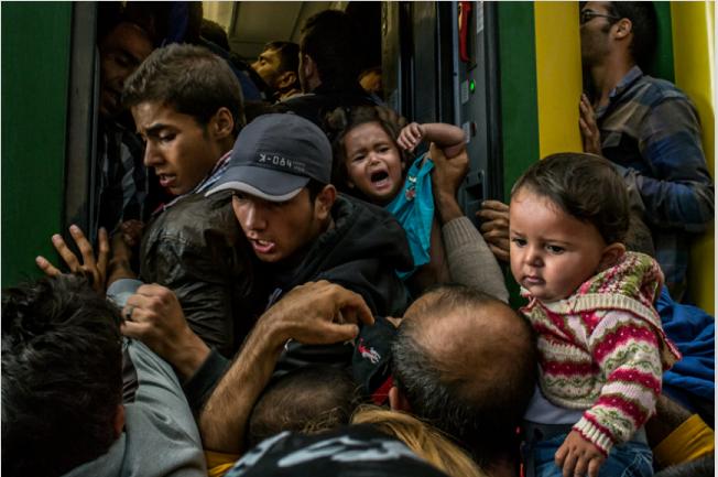 △《纽约时报》图。2015年 一群难民冲上布达佩斯市中心的火车。