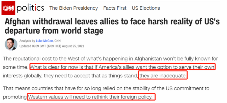 但对这些盟友来说,现在有更清楚的事实摆在眼前,那就是:如果他们想要为自己的利益服务,就目前的情况来看,他们的能力是不够的。这正是美国有线电视新闻网(CNN)在《阿富汗撤军使盟国面临美国退出世界舞台的严酷现实》一文中指出的观点。文章还认为,那些长期依赖美国承诺的稳定来推动西方价值观的国家,将需要重新思考自己的外交政策。