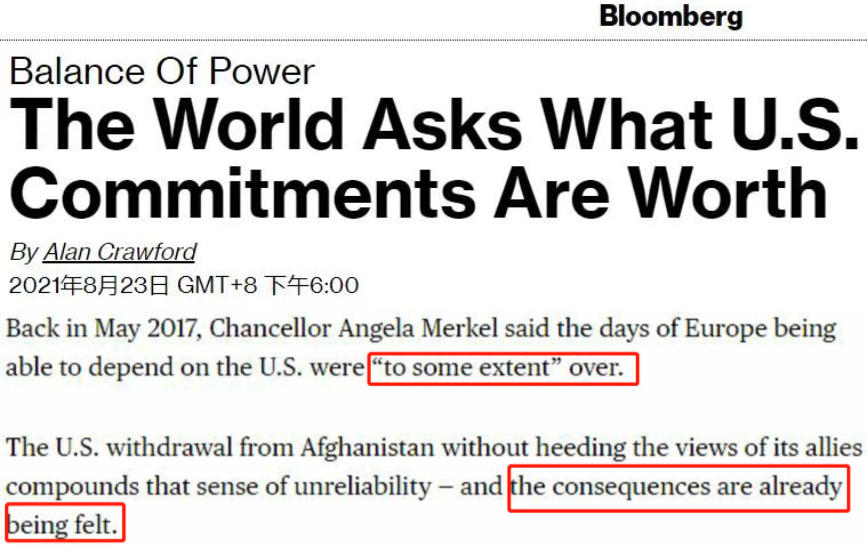 △彭博社:《全世界都在问美国的承诺值多少钱》:早在2017年5月特朗普上台后不久,德国总理安格拉·默克尔(Angela Merkel)就表示,欧洲能够依赖美国的日子“在某种程度上”已经结束。美国在不听取盟友意见的情况下从阿富汗撤军,加剧了这种不信任感。