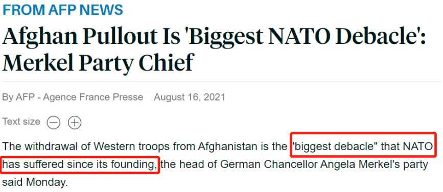 其后果已经显现出来。法国多家媒体报道,德国总理默克尔所在政党的领导人阿明·拉舍特16号表示,西方军队从阿富汗撤出是北约自成立以来遭受的“最大失败”。