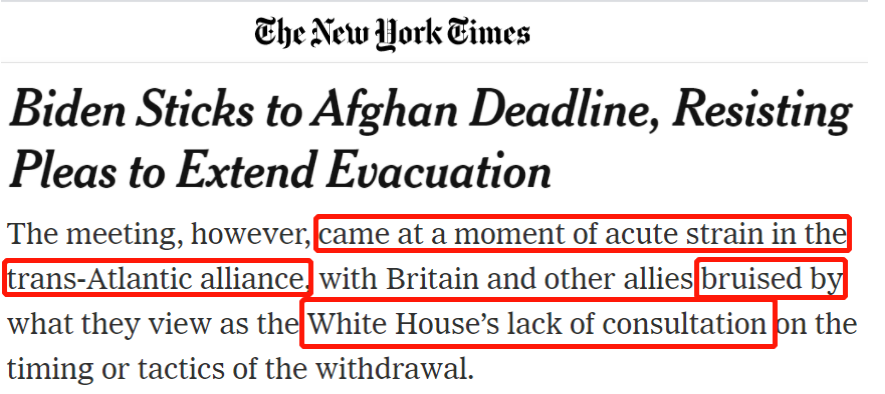 △《纽约时报》报道中说,此次G7会议在跨大西洋同盟关系处于紧张的时刻召开,英国等其他盟友因美方缺乏与其在撤军时间和策略上的协商而倍感挫折。