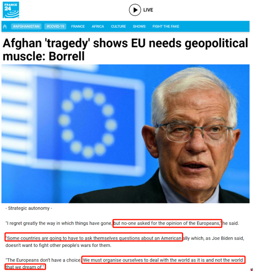 事实上,欧洲人确实开始痛定思痛了。欧盟外交与安全政策高级代表博雷利(Josep Borrell )近日在接受法国媒体的采访时表示,阿富汗局势和撤离乱局表明,“没有人询问欧洲人的意见”。经此一事,欧洲“一些国家将不得不开始思考美国盟友的问题,而且美国总统拜登也说,美国人不想打其他人的战争”。欧洲需要发展独立于美国的、自己的军事能力。“欧洲人没有选择,我们必须自行组织来面对这个世界,而不是幻想”。