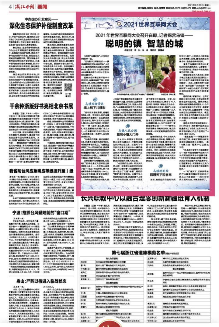 9月13日,《浙江日报》刊发《2021年世界互联网大会召开在即,记者探营乌镇——聪明的镇 智慧的城》一文,全文如下: