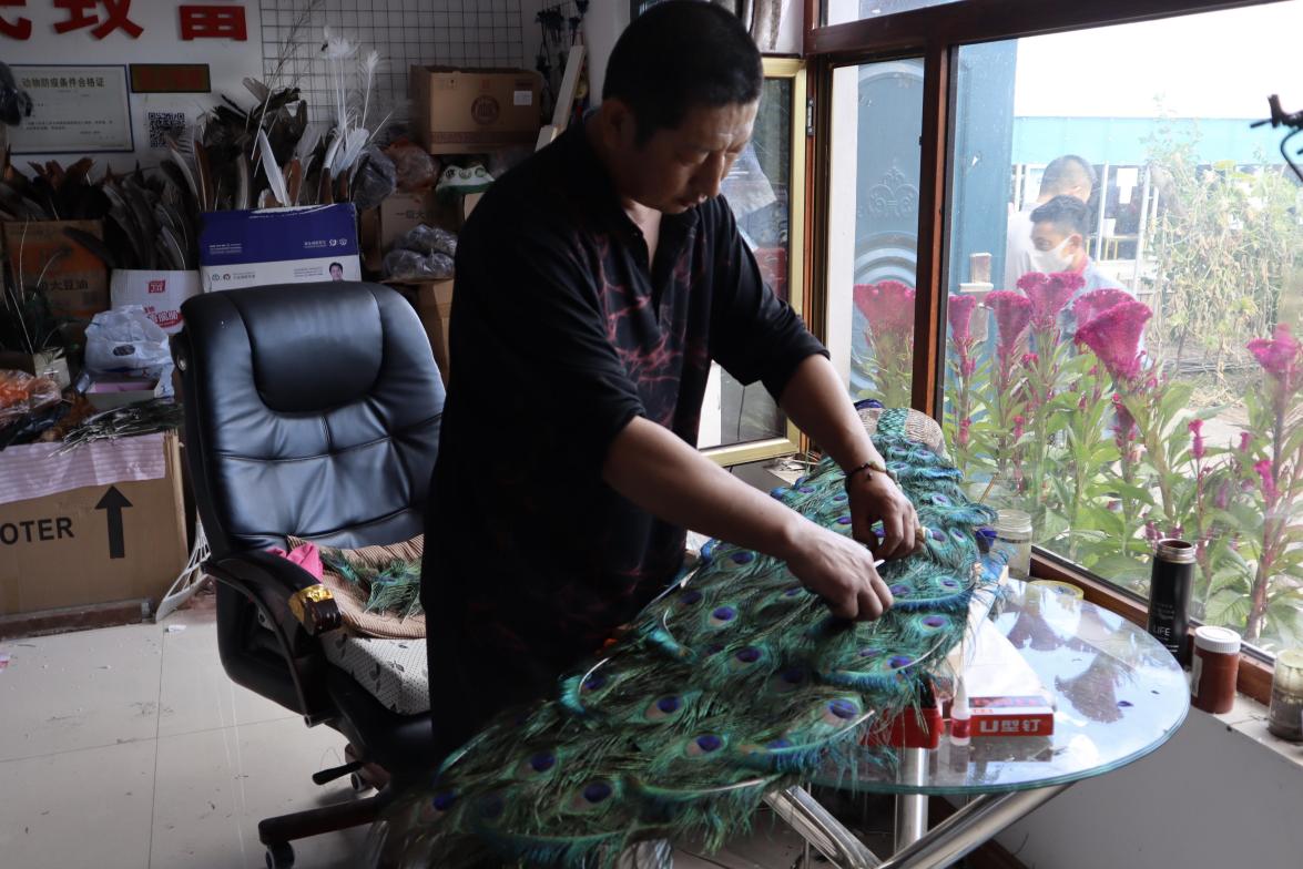 (周海燕在展示孔雀羽毛工艺品制作 央视网记者 王静远 摄)