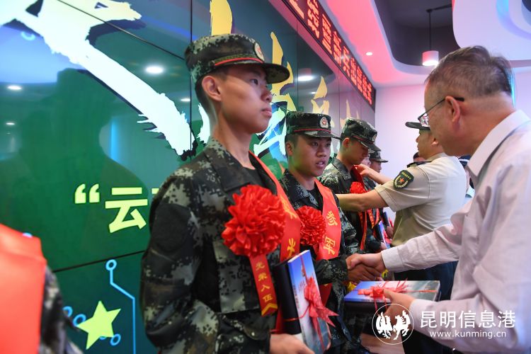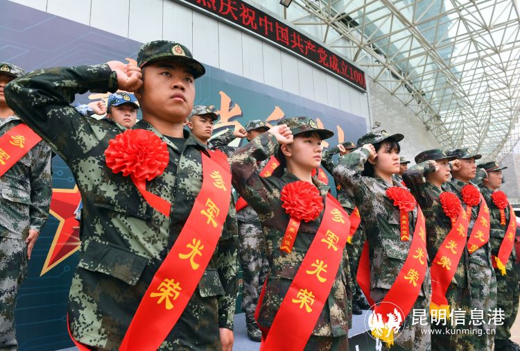 新兵出征仪式上,昆明警备区大校司令员任兴格宣布“云南昆明征兵”微信公众号正式上线,并在活动上宣读昆明市人民政府征兵办公室命令,宣布2021年秋季1500余名新兵线上出征。与会军地领导为新兵代表佩戴红花绶带、赠送学习书籍,勉励新兵早日建功军营。
