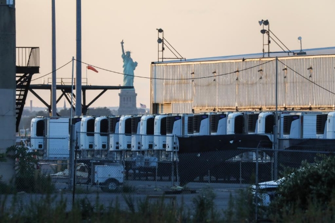 这是9月6日在美国纽约布鲁克林拍摄的一处临时停尸场内存放新冠患者遗体的冷藏车。新华社记者 王迎 摄
