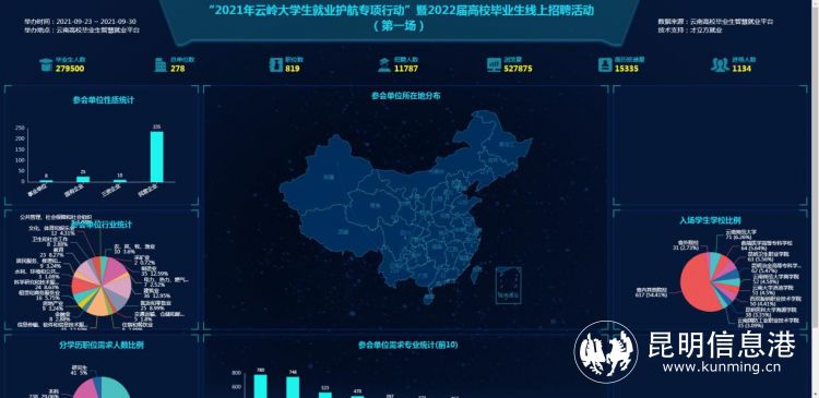 昆明信息港讯 记者戴云 9月23日—29日,第一场“2021年云岭大学生就业护航专项行动暨2022届高校毕业生线上招聘活动”在云南高校毕业生智慧就业平台成功举办。来自省内外近300家用人单位及近30000余名毕业生参加,发布职位数819个,招聘人数达11787人次,投递简历15330余份,浏览量突破五十余万次。