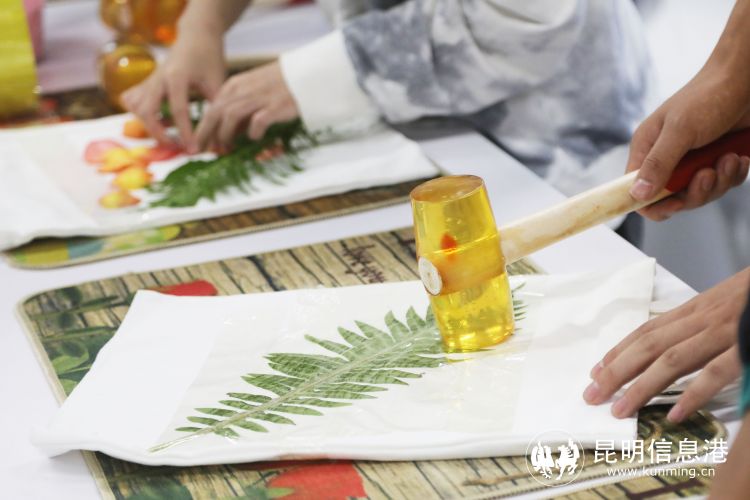 10月9日至10日期间,每天18点至20点,地铁五一路站不仅有“地下森林”COP15主题展览,更有新奇手工体验等您来参与!活动时间内到达五一路站,您可以使用天然植物,自由发挥想象,组合出喜爱的图案,便可将植物拓染于方巾之上。8号上午,工作人员刚刚把体验用具摆出来,就有一大批市民迫不及待的来提前体验了一波,树叶和花瓣被大家拓印在帆布袋或者小方巾上。小朋友在妈妈地陪伴下认真的敲着小锤,还有一个来昆明出差的小哥哥也忍不住停下了行走的步伐,拓了一块小方巾当做来云南的第一个纪念品……