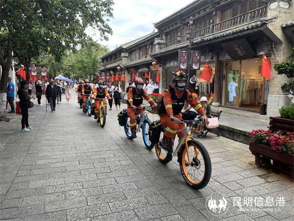 就这样,“火焰蓝自行车消防巡查队”一遍一遍的深入大理古城及生态廊道对每条大街小巷,每家商铺客栈反复进行防火巡查、宣传教育,及时整改隐患,不留任何一个角落;对每一个游客的咨询提问进行答疑解惑……看似忙忙碌碌的一天,却也只是“火焰蓝自行车巡查队”最平凡的一天,10公里、50公里、100公里、200公里……500公里,“火焰蓝自行车消防巡查队”每天累计的骑行距离也正是他们用实际行动对“对党忠诚、纪律严明、赴汤蹈火、竭诚为民”的训词精神的生动践行。(昆明信息港 记者劳学丽 通讯员李银江)