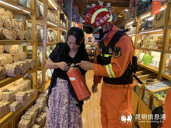 “您好,请问您是这家客栈的管理人吗?灭火器会不会使用?我来教你吧,使用非常简单,记住这个口诀‘提、拔、握、压’……”