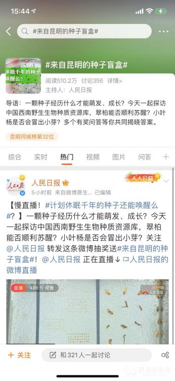 据了解,本次慢直播由人民日报新媒体、中国移动咪咕联合发起,带领网友在线探访中国西南野生生物种质资源库,近距离观察胡杨、钻天柳等七种植物种子的萌发实验。慢直播期间,编辑将随机抽取参与互动答题的网友,送上“春城之邀——一粒来自昆明的种子”盲盒。
