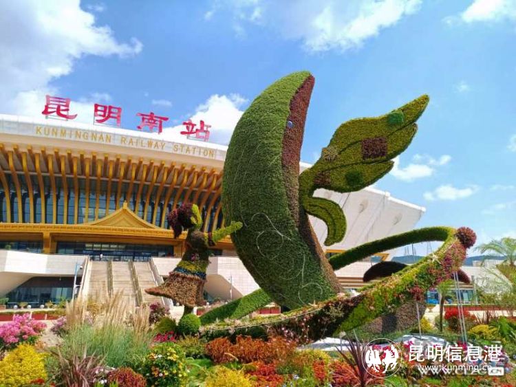 “开放昆明”花坛位于呈贡区昆明南站,主体选取昆明经济交通发展的地标一昆明南站和长水机场作为原型,提取轨道、高铁、飞机的造型元素,向远道而来的客人展示昆明市经济文明发展的多样性、新兴科技的多样性、人与生态和谐共存的多样性,积极响应创新、协调、绿色、开放、共享五大发展理念号召,预祝COP15大会圆满成功。