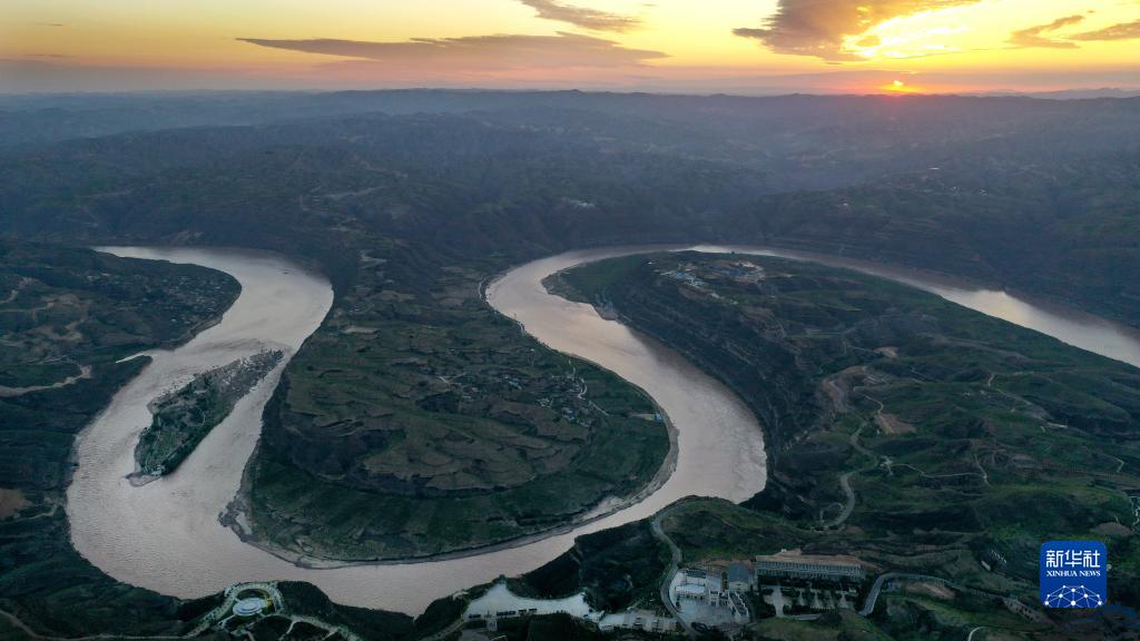 朝霞下的黄河乾坤湾(2019年8月14日摄,无人机照片)。新华社记者 陶明 摄