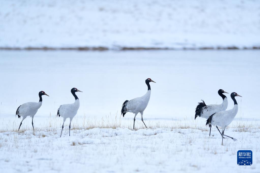 2021年10月21日在位于青海省的三江源国家公园黄河源园区内拍摄的黑颈鹤。新华社记者 张龙 摄