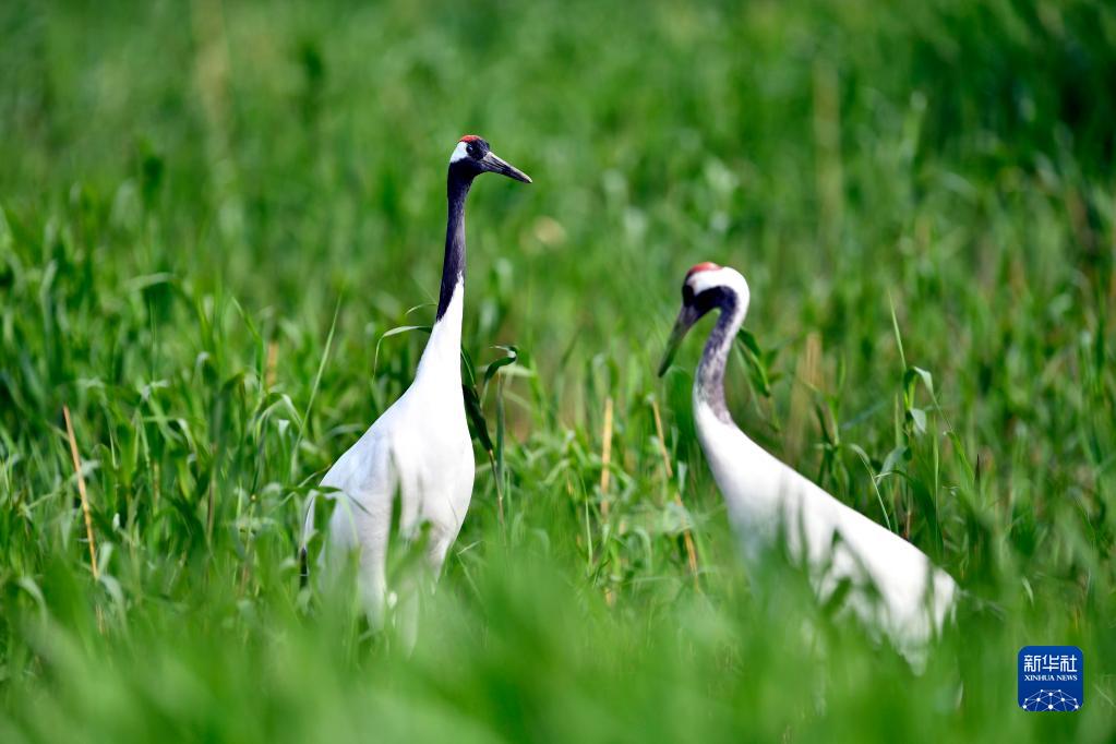 在山东黄河三角洲国家级自然保护区,丹顶鹤在水草间栖息(2021年5月13日摄)。新华社记者 郭绪雷 摄