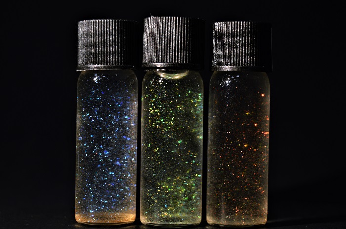 这种闪光剂由纤维素纳米晶体制成,是通过结构色来改变光线,从而焕发出鲜艳的颜色。在自然界中,譬如蝴蝶翅膀和孔雀羽毛的闪光,都是结构色的杰作,这种色彩经历一个世纪也不会褪色。