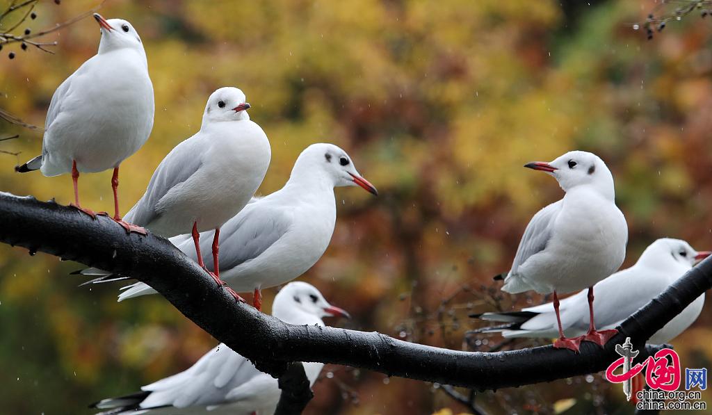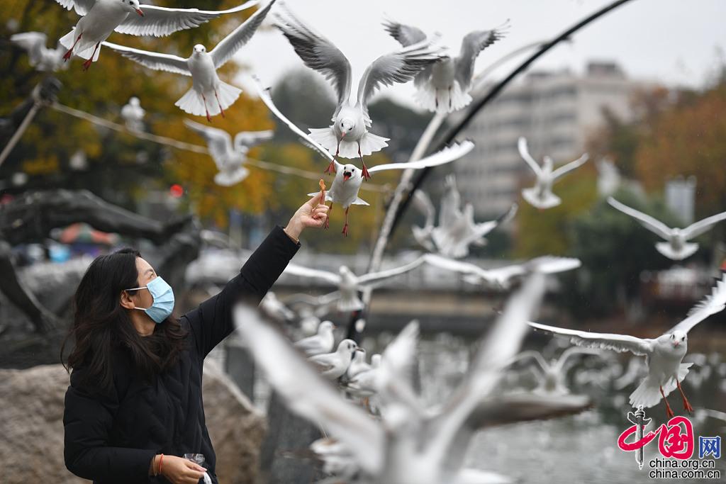 2021年11月14日,昆明,市民在大观河畔投喂红嘴鸥。(视觉中国 杨峥/摄)