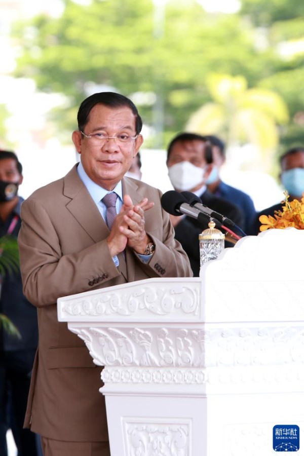 11月17日,柬埔寨首相洪森在金边国际机场举行的中国援柬第七批新冠疫苗迎接仪式上致辞。(新华社发 李莱/摄)