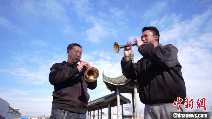 李晓盼(右)在吹奏唢呐。 吴琼 摄