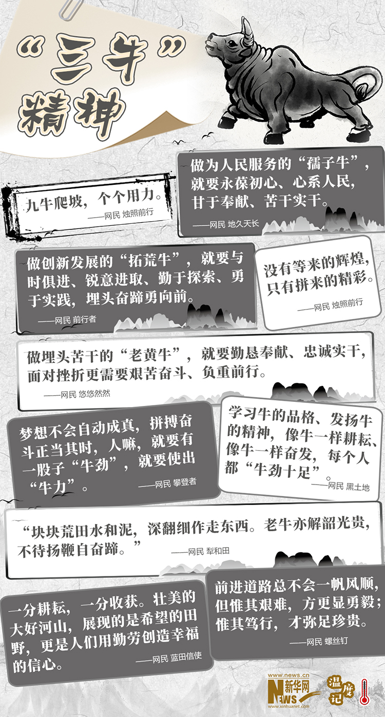 九牛爬坡,个个用力。在中华文化里,牛是勤劳、奉献、奋进、力量的象征,深受中国人民的喜爱。“为民服务孺子牛、创新发展拓荒牛、艰苦奋斗老黄牛”也成为百年来,带领中华儿女团结奋进的中国共产党人的生动写照。最是精神动人心。“以百姓心为心,与人民同呼吸”,一百年来,中国共产党人“俯首甘为孺子牛”,始终坚守为中国人民谋幸福、为中华民族谋复兴的初心和使命,团结带领全国各族人民为争取民族独立、人民解放和实现国家富强、人民幸福而不懈奋斗;“蹚没走过的路,拓没垦过的荒”,无数共产党人在前进道路上争当“拓荒牛”,砥砺奋进,锐意进取,于万千荆棘中杀出血路,从无到有开天辟地,创造了彪炳史册的人间奇迹;勤恳奉献、忠诚实干,在新中国成立后的一穷二白中“头拱地、脚朝天”,如“老黄牛”一般,从“一辆汽车、一架飞机、一辆坦克、一辆拖拉机都不能造”的制造业窘境中,建立起了全世界最完整的现代工业体系,从“电话也是奢侈品”的联络困境,实现了如今的信息畅通、公路成网、铁路密布、高铁飞驰、巨轮远航、飞机翱翔、漫步太空……胸中若有凌云志,不待扬鞭自奋蹄。今天的幸福是一点一滴干出来的,追梦人的世界从来没有停一停、歇一歇的懈怠。“学习牛的品格、发扬牛的精神,像牛一样耕耘、像牛一样奋发。”社交平台上,人们热情讴歌牛的品质,汲取可贵的精神力量。前进路上,发扬“三牛”精神,鼓足“牛劲”,充满“牛气”,披荆斩棘、开拓创新、坚毅前行,新时代的中国一定更“牛”!(文字:徐可 海报设计:王晔)