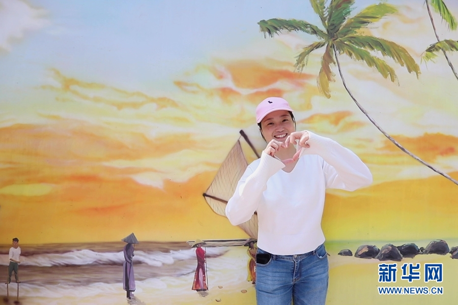 游客在京族文化特色墙绘前拍照打卡。(东兴市融媒体中心供图)