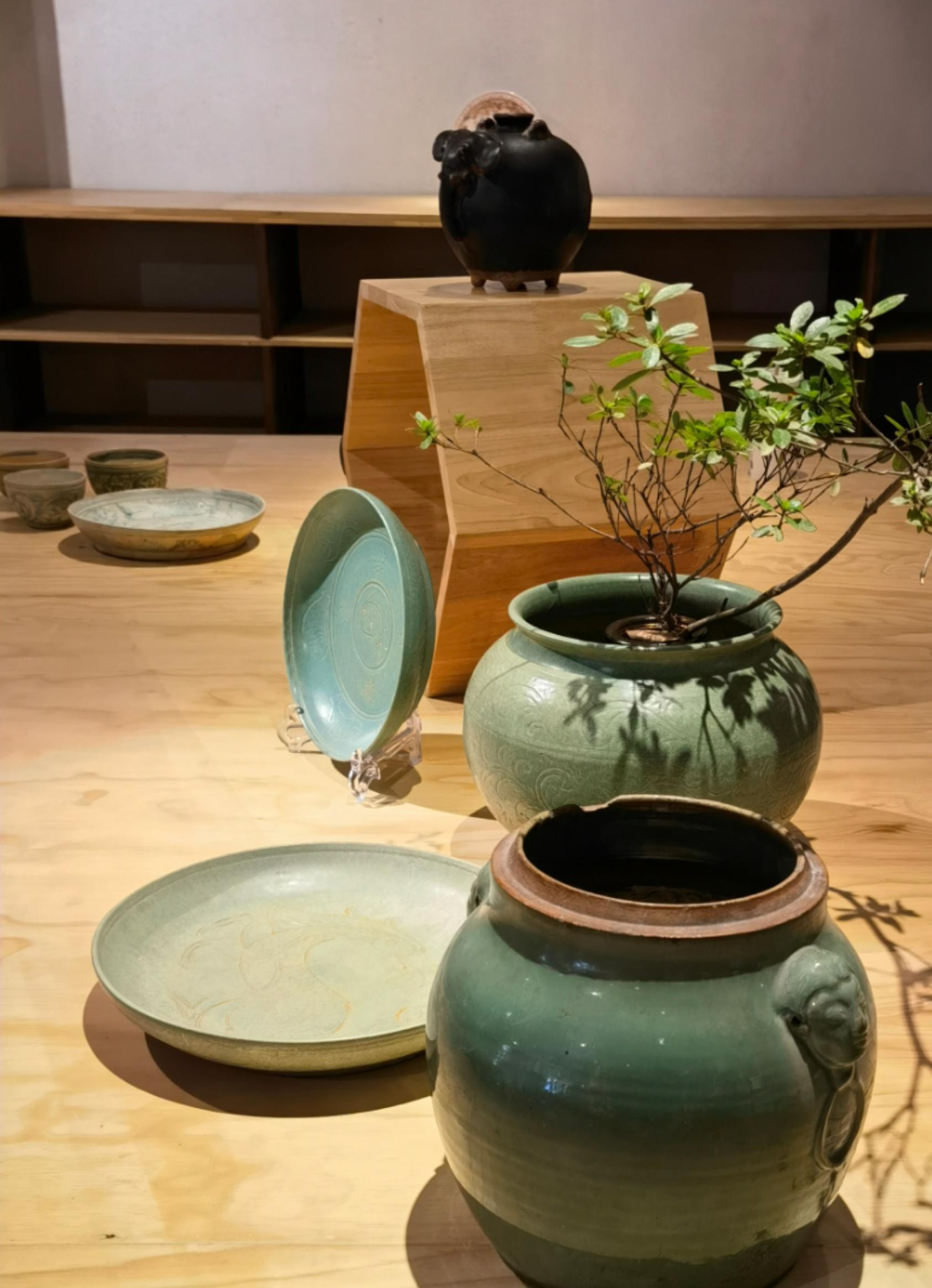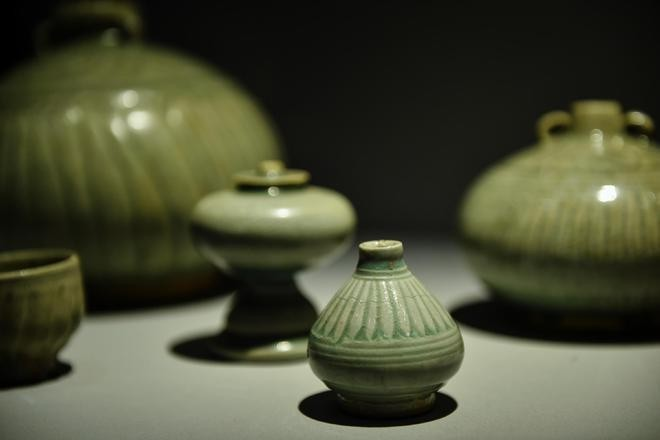 (兰纳地区绿釉陶与华宁绿釉陶——昆明《文明互鉴》艺术展览场景,靠最近的一个为云南玉溪华宁绿釉陶)