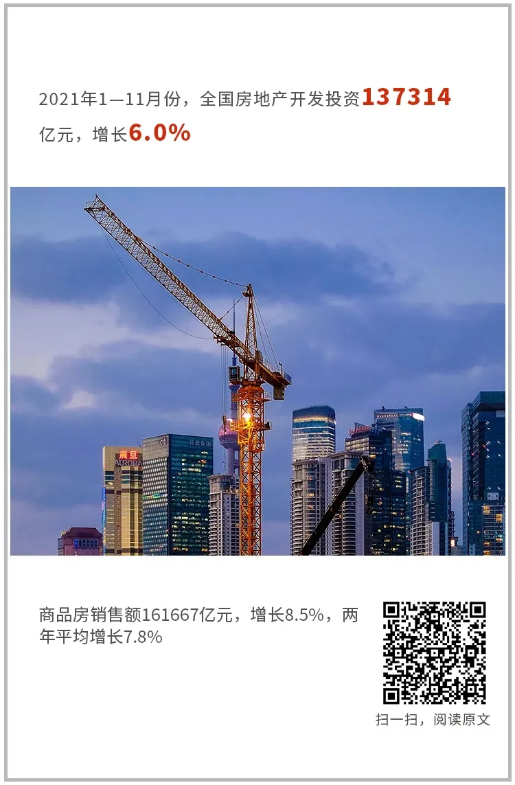 1-11月份,全国固定资产投资(不含农户)494082亿元,同比增长5.2%,比1-10月份回落0.9个百分点;两年平均增长3.9%,比1-10月份加快0.1个百分点;11月份环比增长0.19%。分领域看,1-11月份基础设施投资同比增长0.5%,制造业投资增长13.7%,房地产开发投资增长6.0%。全国商品房销售面积158131万平方米,同比增长4.8%,两年平均增长3.1%;商品房销售额161667亿元,同比增长8.5%,两年平均增长7.8%。