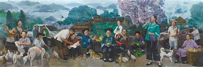 为表现湖南省湘西土家族苗族自治州花垣县十八洞村的新风貌,油画家黄礼攸、黄子恺、贾文广、李海华走村社、下田头,细心了解村民日常,深入体验田园劳作,在广泛收集第一手图像资料的同时,进一步提炼升华故事原型。作品《春天来喽》以6米长的画卷,将十八洞村的创业故事娓娓道来。画面中,十几位乡亲笑意盈盈,纯朴自然。他们中,既有返乡青年、致富能手,也有创业模范。画面构图错落有致,人物形态各不相同,村社亭阁疏密相间,穿插其中的轿车、货车为画面增添了现代感,传统苗绣服饰等尽显文化意蕴。在人才返乡、产业兴旺、三代同乐的幸福生活中,春天的气息透过作品扑面而来。