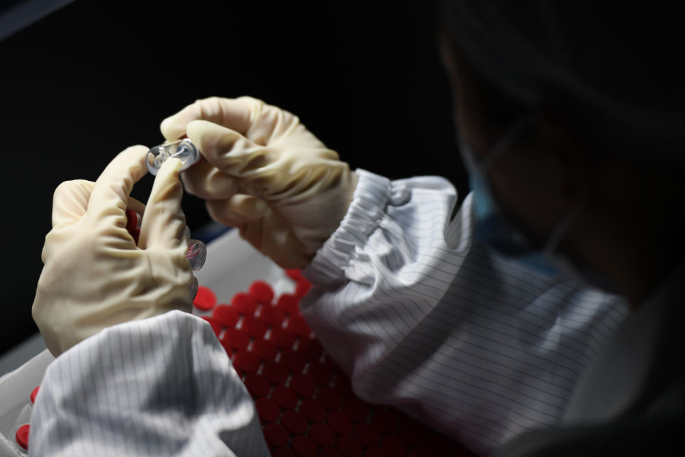 工作人员在国药集团中国生物北京生物制品研究所的新冠病毒灭活疫苗分包装车间内工作(2020年12月25日摄)。新华社记者 张玉薇 摄