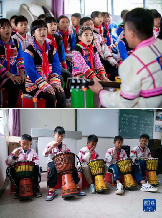 拼版图片:上图为基诺山基诺族乡民族小学学生在音乐课上唱歌(12月13日摄);下图为基诺山基诺族乡民族小学学生在音乐课上打手鼓伴奏(12月13日摄)。新华社记者陈欣波 摄