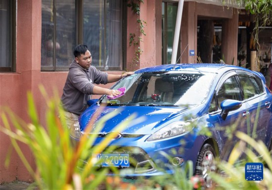 基诺山基诺族乡新司土村巴飘组的一名青年在洗车(12月12日摄)。新华社记者 陈欣波 摄