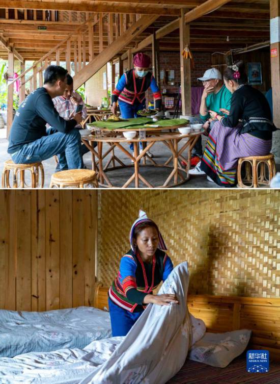 拼版图片:上图为基诺族村民姿梅(中)在自家开办的农家乐里为游客端上基诺族美食(12月12日摄);下图为基诺族村民姿梅在自家开办的民宿里整理床铺(12月12日摄)。新华社记者陈欣波 摄