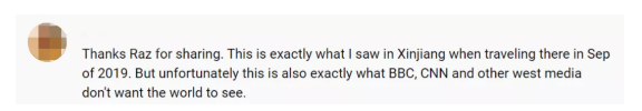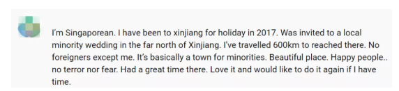 ▲我是新加坡人,在2017年曾到新疆度假。当时我在疆北被邀请参加一个当地少数民族的婚礼,那是一个主要由少数民族组成的城镇,风景秀丽,民众欢乐......没有恐怖或恐惧。我在那里度过了一段美好的时光。我喜欢那里,如果有时间,我还想再去一次。