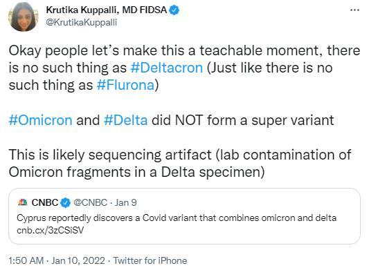 晚些时候,世卫组织卫生紧急项目技术负责人玛利亚·范凯尔克霍弗也针对这一问题在社交媒体发文,她同样认为,之所以会出现“德尔塔克戎”,很可能是实验室在测序过程中发生了污染,并呼吁不要再使用“德尔塔克戎”的叫法。