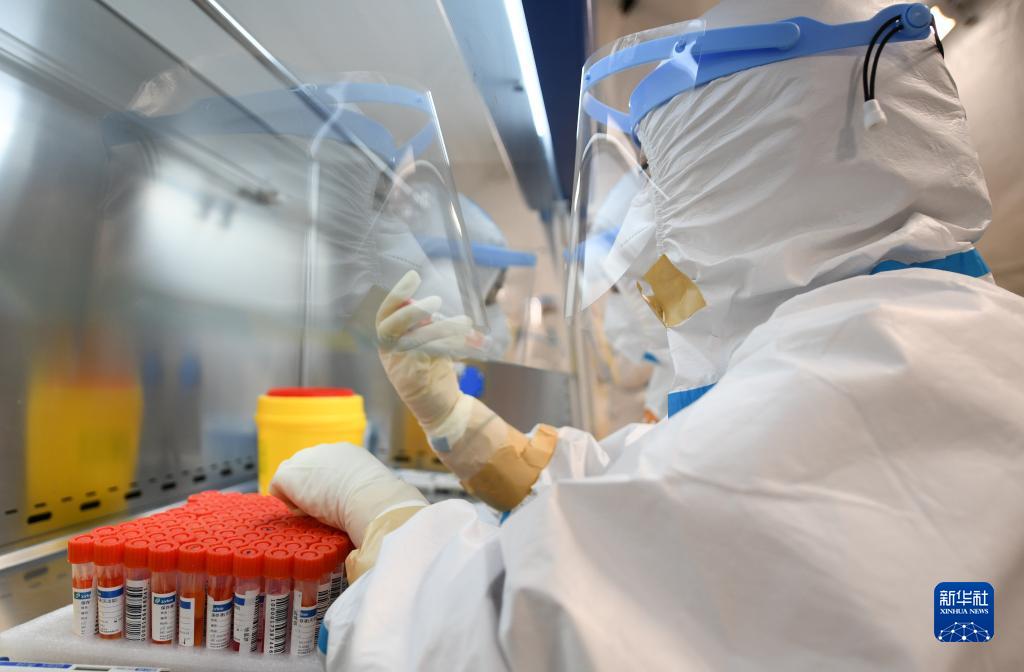 1月13日,在天津市北辰区某高校,气膜实验室工作人员在样本处理区作业。新华社记者孙凡越摄