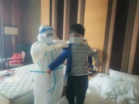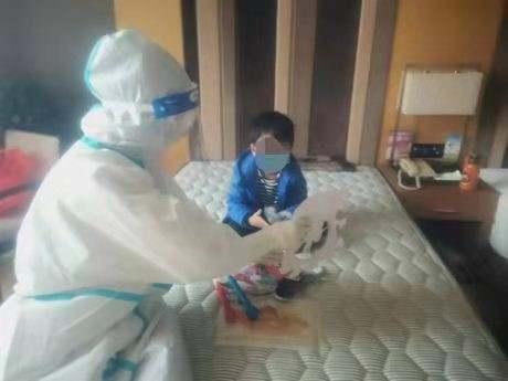 护士刘列平、常芬在隔离酒店轮流陪伴4岁的乐乐。