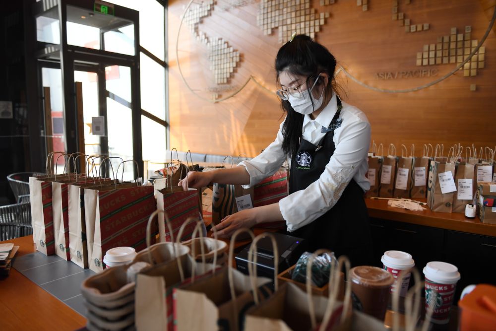 1月13日,在西安市一家连锁咖啡店,店员整理外送的咖啡饮品。新华社记者 李一博 摄