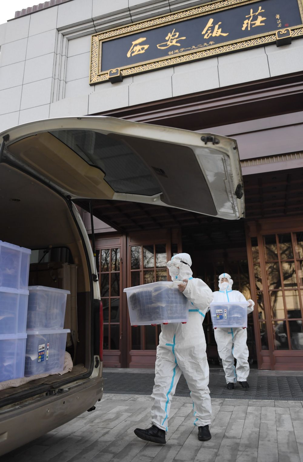 1月13日,在西安市西安饭庄东大街总店,工作人员将打包好的团餐装车外送。新华社记者 李一博 摄