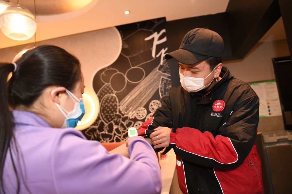 1月13日,在西安市一家连锁餐厅,工作人员对配送员(右)测量体温。新华社记者 李一博 摄