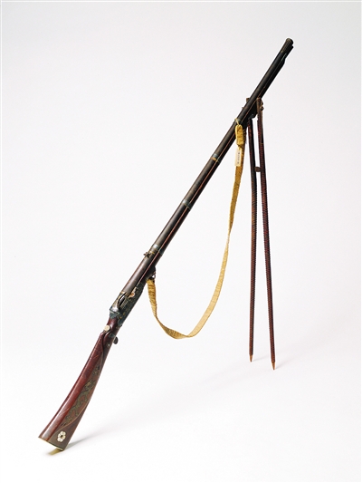 相比而言,燧发枪通过燧石与火镰的撞击发出火星,进而引燃火药,可解决点燃火绳带来的种种不便,且较火绳枪安全、可靠,故宫藏木琵琶鞘托燧发枪即为其中典型代表。